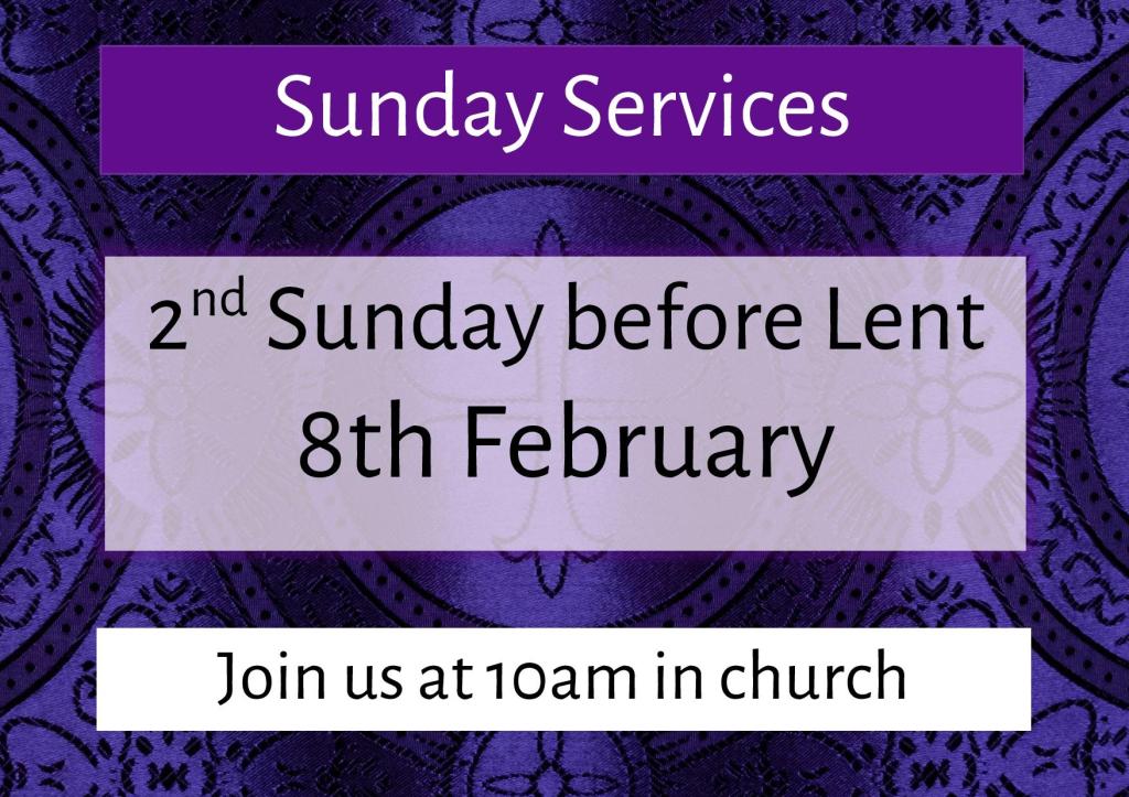 Join us this Sunday (2nd Sunday before Lent) for our usual (said) communion service at 8.00am and Parish Eucharist at 10am. You are always welcome at all and any of our services. If you’d like to spend some time in quiet reflection and prayer, the church is open this coming week Monday – Friday from around 10am – 3pm (Wednesday from 11am).