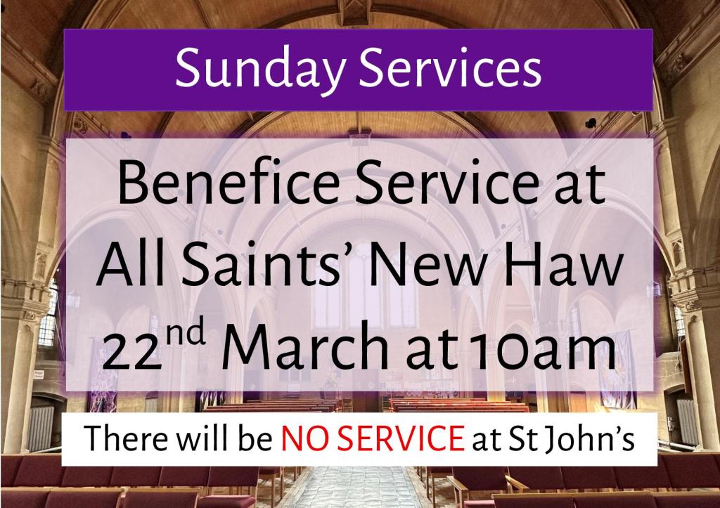 Join us this Sunday (Lent 5) for our usual (said) communion service at 8.00am and our Benefice Service at 10am, which will be held at All Saints’ Church New Haw. PLEASE NOTE THERE WILL BE NO 10AM SERVICE AT ST JOHN’S. You are always welcome at all and any of our services. If you’d like to spend some time in quiet reflection and prayer, the church is open this coming week Monday – Friday from around 10am – 3pm (Wednesday from 11am).
